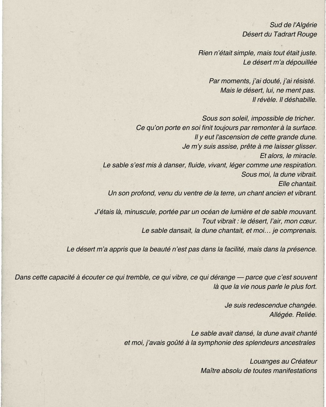 Certaines ont pris des décisions importantes. D’autres ont retrouvé confiance. Toutes ont laissé un morceau d’elles dans le désert, et ramené un morceau du désert en elles. Et pour clôturer voici en partage ce que ce voyage hors du temps a inspiré à Cécile.